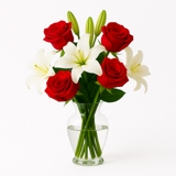 Buquê de noiva composto por 3 hastes de lírios brancos e 6 rosas vermelhas, complementado por 10 hastes de mosquitinho branco que suavizam a intensidade das cores e equilibram a composição. O arranjo tem presença elegante e proporções harmoniosas, unindo romantismo e sofisticação. Os caules são totalmente envolvidos por fita branca acetinada, garantindo um acabamento clássico, delicado e atemporal para o grande dia.