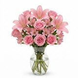 Buquê de noiva com 1 haste de lírio branco, 3 rosas brancas e 3 alstroemérias brancas, complementado por 5 hastes de mosquitinho branco que trazem leveza e suavidade ao conjunto. A composição é delicada e equilibrada, com presença marcante sem exageros. Os caules são totalmente envolvidos por fita branca acetinada, criando um acabamento elegante, ideal para noivas que buscam simplicidade refinada, delicadeza e significado no grande dia.