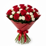 Buquê elegante com 20 rosas vermelhas naturais, dispostas em uma composição densa e harmoniosa que chama atenção de imediato. Embalado em celofane preto metalizado e finalizado com laço refinado, é um clássico atemporal, feito para impressionar e marcar ocasiões especiais com sofisticação e presença.
