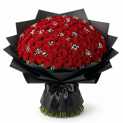 Buquê com 100 rosas vermelhas selecionadas, montado com alto volume e acabamento premium em embalagem preta sofisticada com laço elegante.